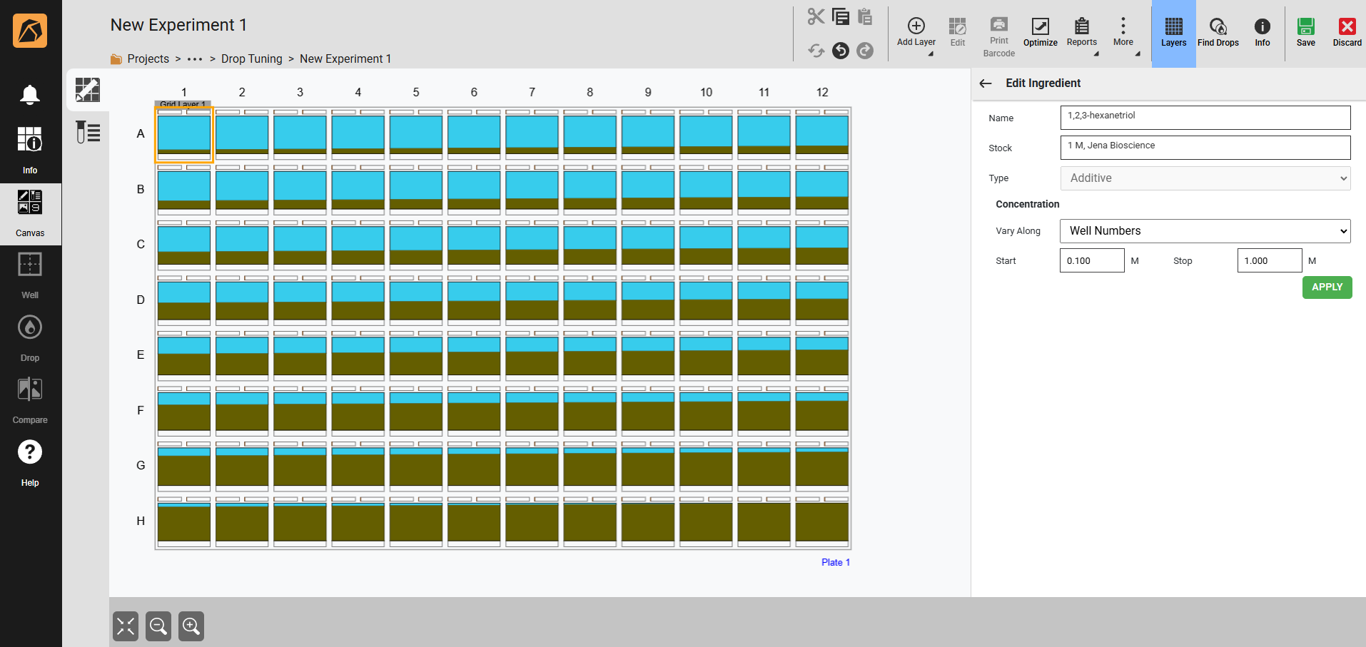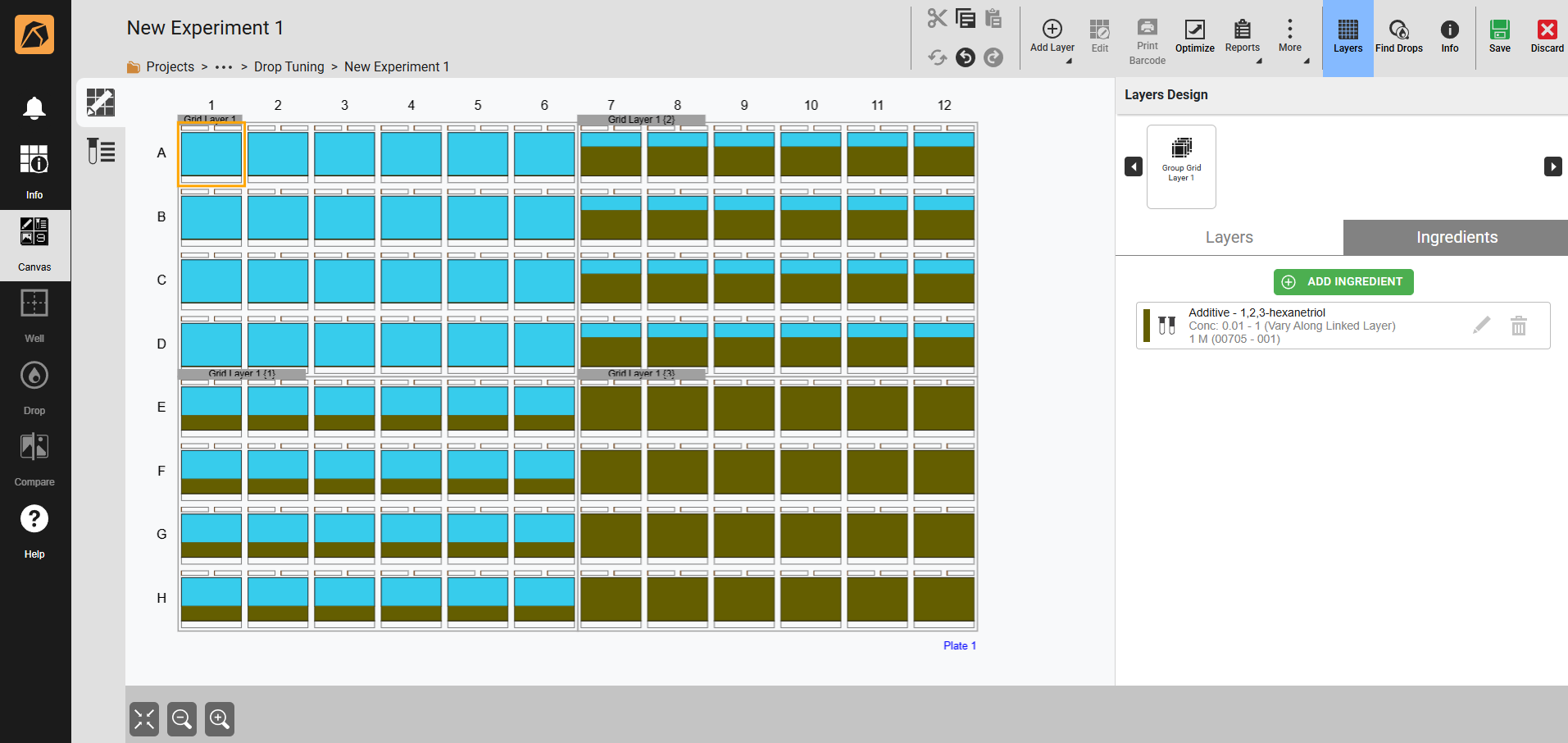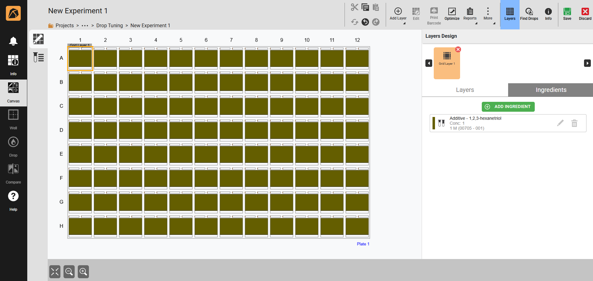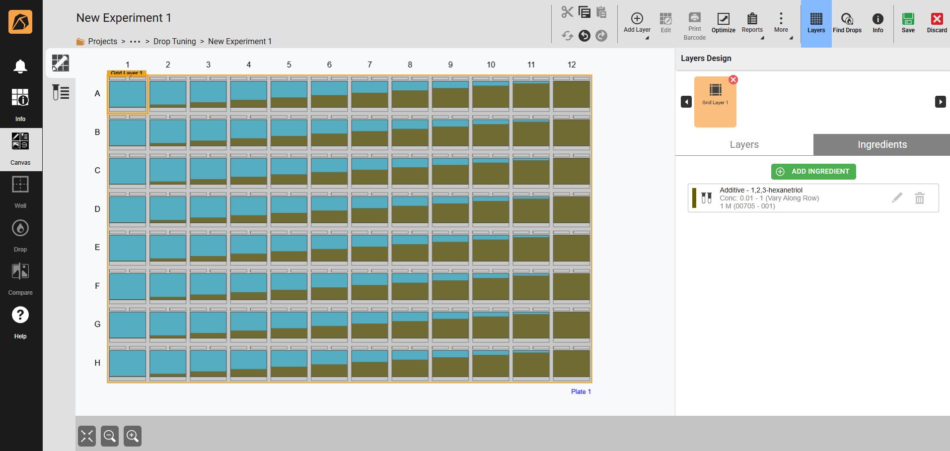 Grid layer allows you to incrementally vary ingredients’ concentrations and pH levels along the rows and columns of a layer or from one layer to another through sub-layers. It optimizes crystal-forming conditions by varying each ingredient combination in an organized and controlled manner.