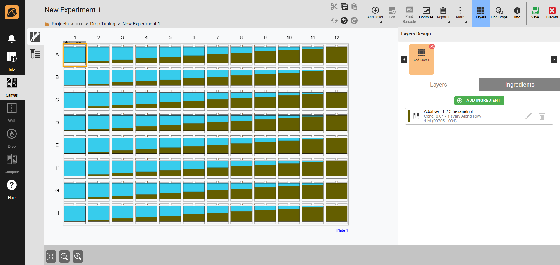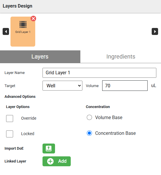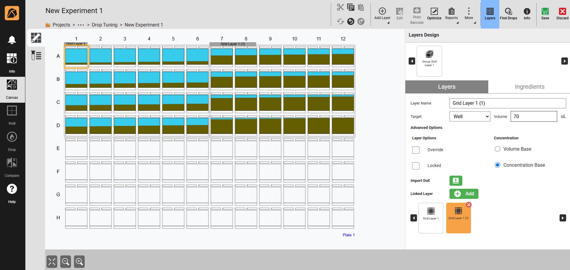 Linked Layers: concentration increases gradually from the Start to Stop values throughout selected linked layers. As a copy of a grid layer with the same ingredients and size, every well in each linked layer has the same value. While the rows and columns of the original grid allow methodical variation in two dimensions, adding a linked layer allows for the third dimension variation.