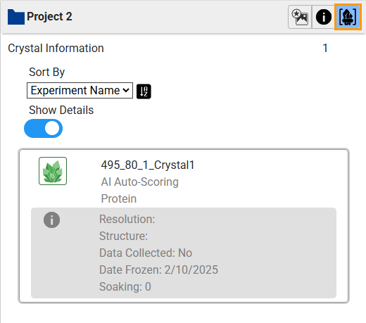to arrange the crystal list based on the selected filter (Experiment Name, Crystal Name, or Protein Name) in an ascending or descending order.Switch on the Show Details toggle button to view each crystal’s details, including Resolution, Structure, Data Collected, Date Frozen, and Soaking.