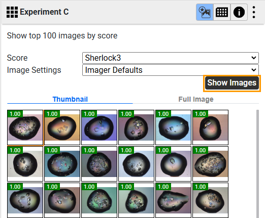 displays a number of top scored images based on the selected score and imaging settings. You can view up to 200 images across multiple experiments. This tab is only available in the project and experiment side panels.Note