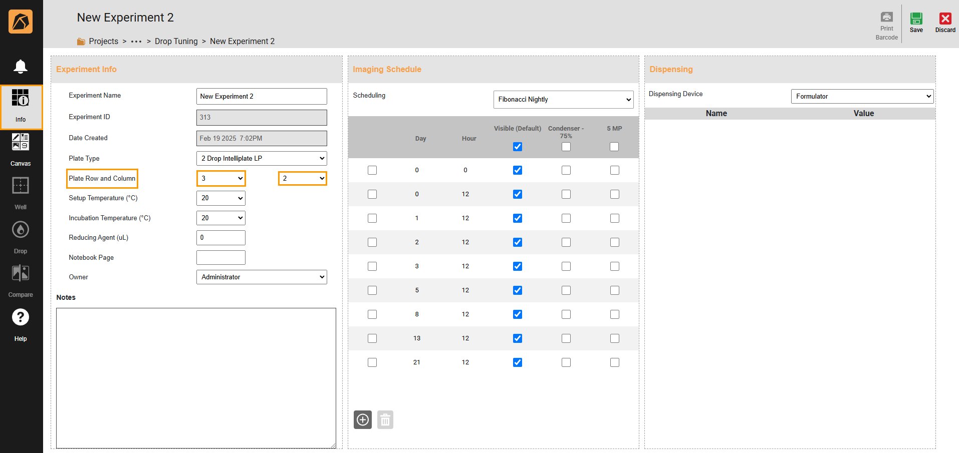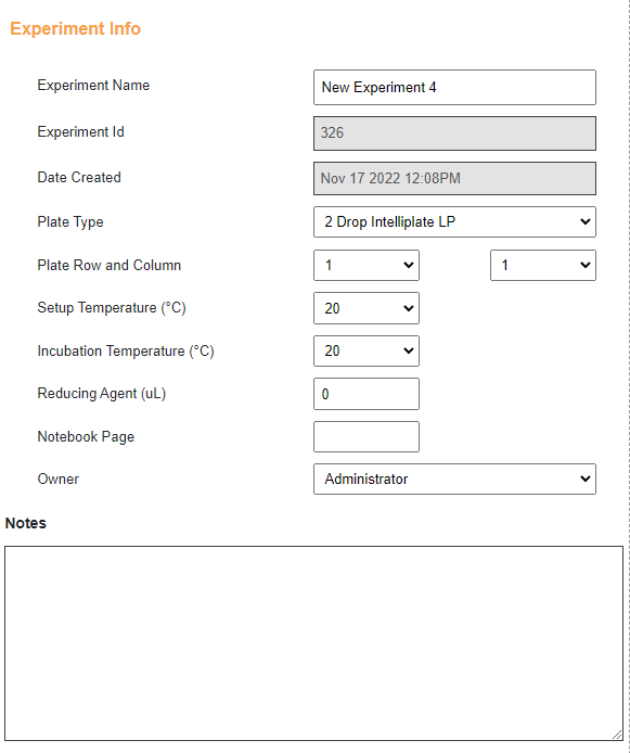 Go to the Experiment Info section in the Info menu and define the number of plates you want to have in the Plate Row and Column fields. The first field defines the row, and the second specifies the column. If you want to have six plates arranged in three rows and two columns, like the example below, select three in the first field and two in the second field.