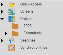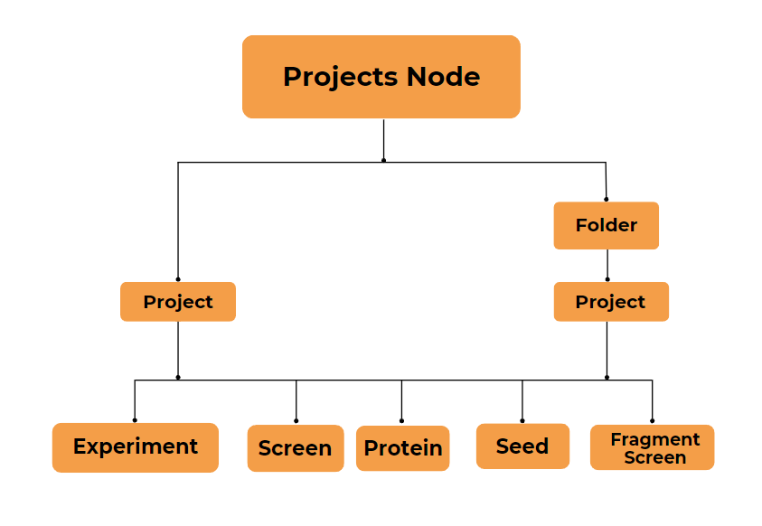 The Projects node projectsnode is where you likely spend most of your time. This is where projects projectfolder and folders folderfolder are located. A project contains experiments, screens*, proteins, seeds, and fragment screens, while a folder contains projects.