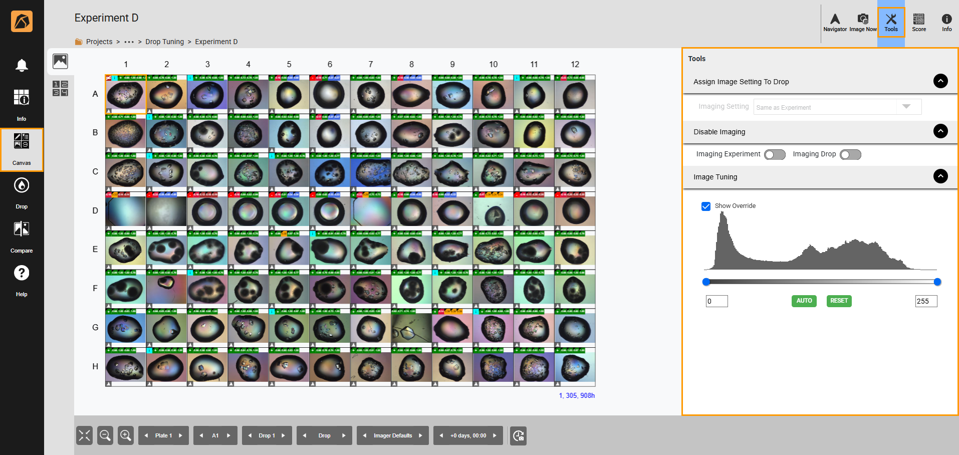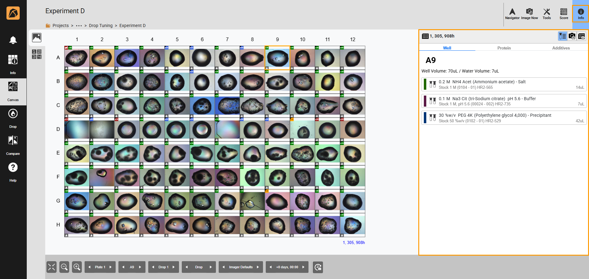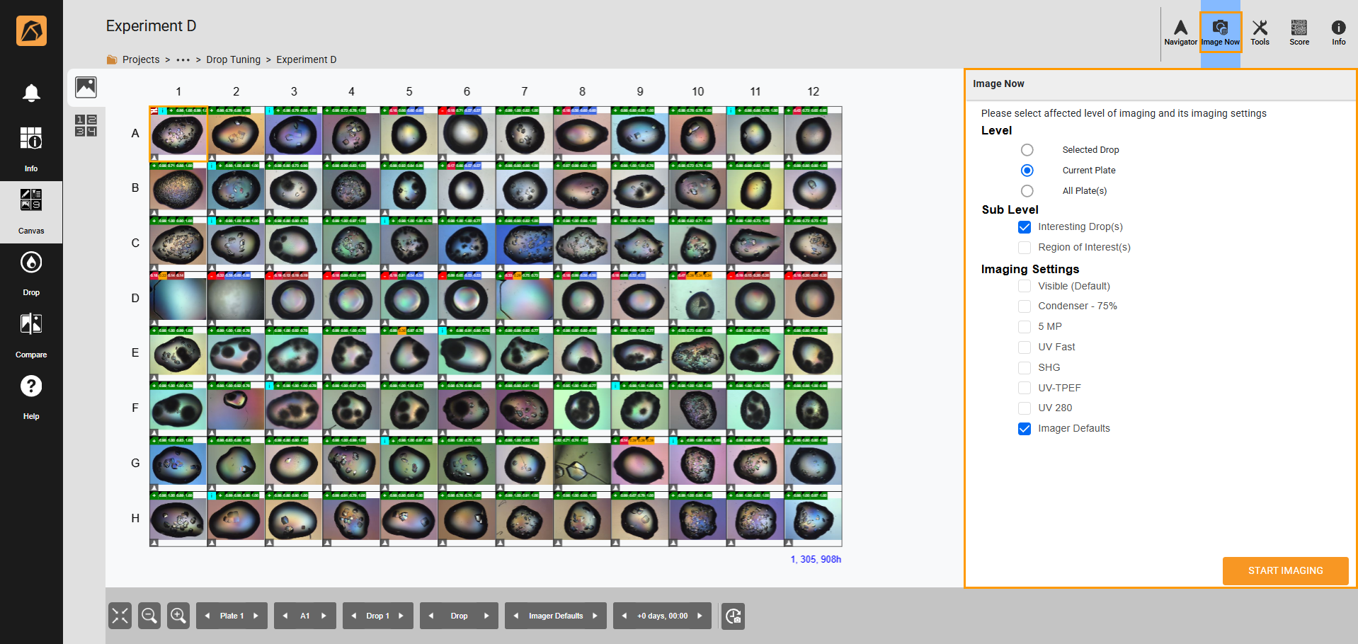 on the top right bar. It allows you to browse plates, wells, drops, regions, imaging settings, and imaging sessions.Image Now