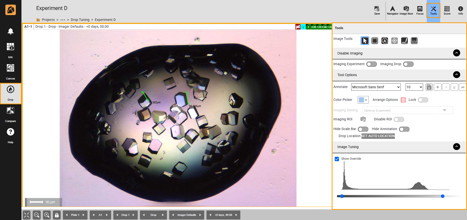 The Tools panel is available in the Canvas, Drop, and Compare menus. It allows image modifications, including disabling imaging, tuning images, defining regions of interest, adding notes, scribbling, and measuring crystals.