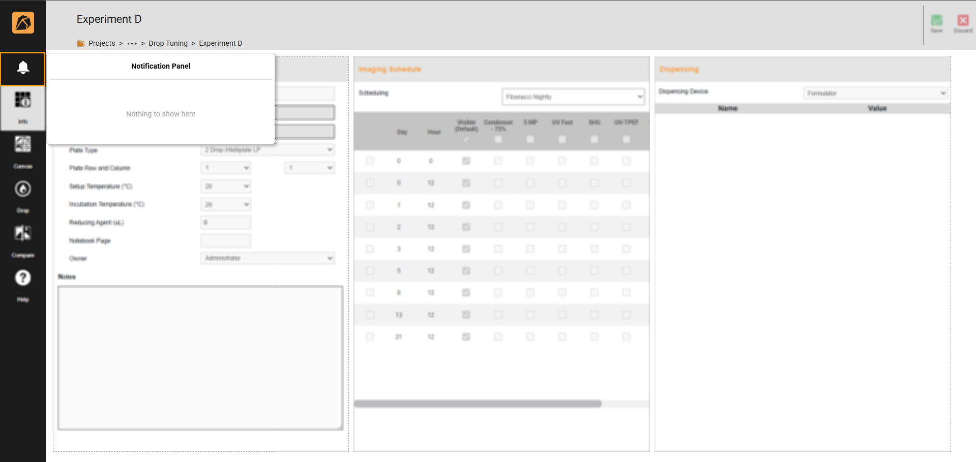 Displays the experiment information, imaging schedule, and dispensing properties.