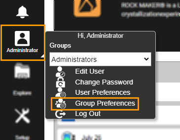 The Group Preferences submenu – accessible from the User menu – manages settings for each available group. Group settings apply to all users in the group, but a group member can adjust the settings using the User Preferences submenu.