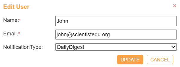 The Edit User dialog box will appear. Update any applicable fields: Name, Email, or both. If you are an administrator, the Name field will be uneditable.