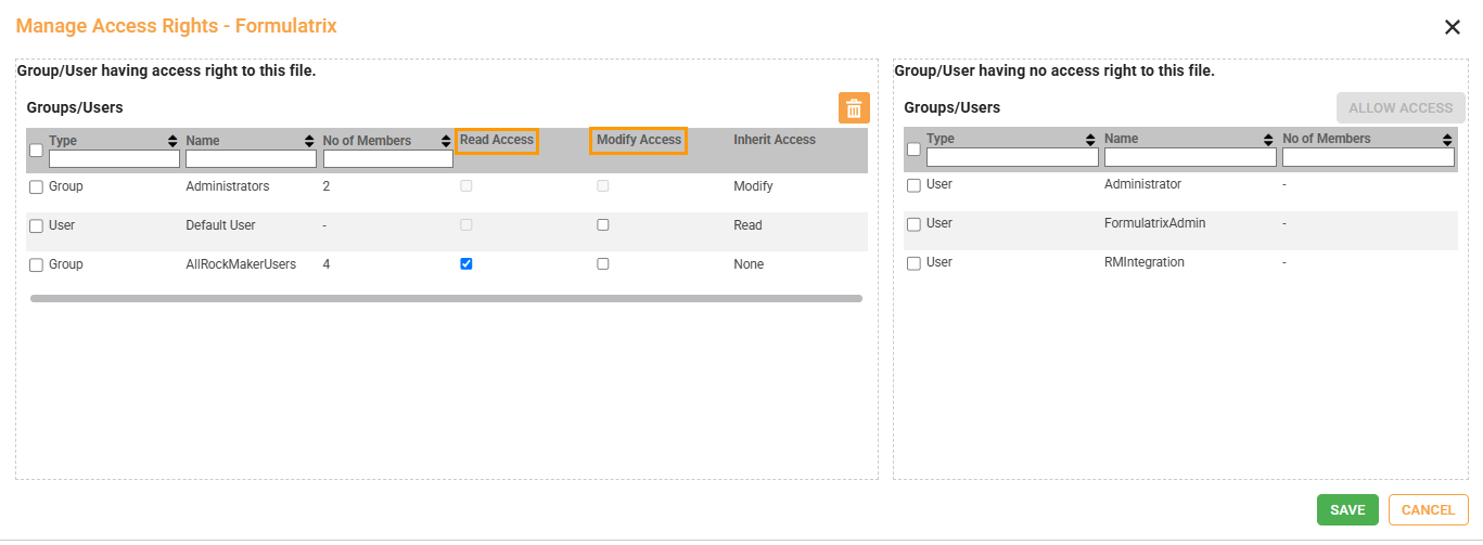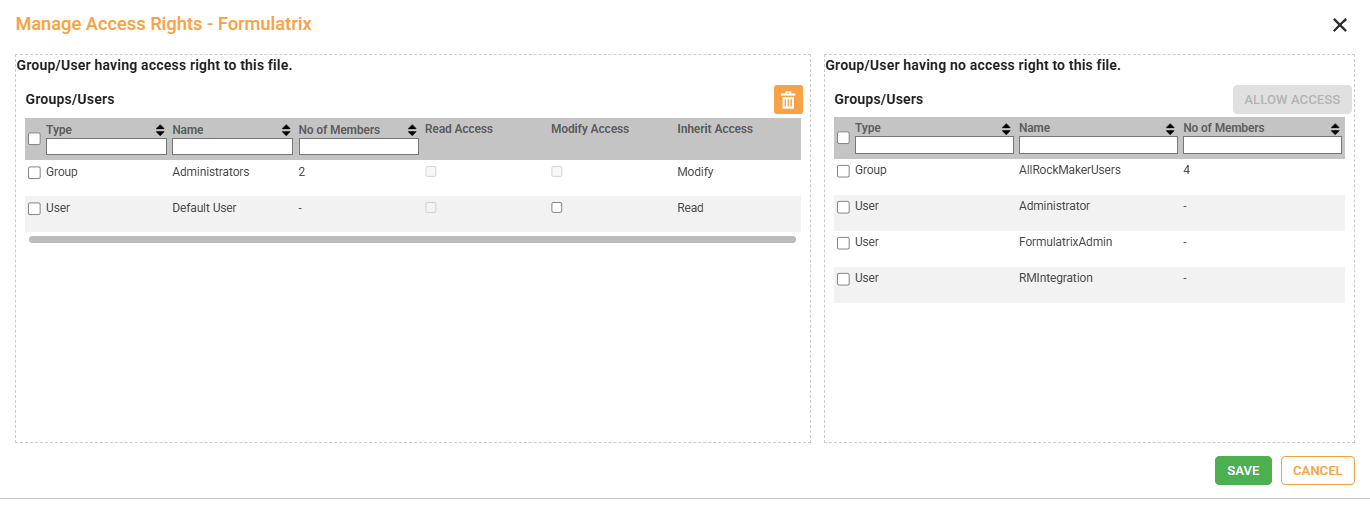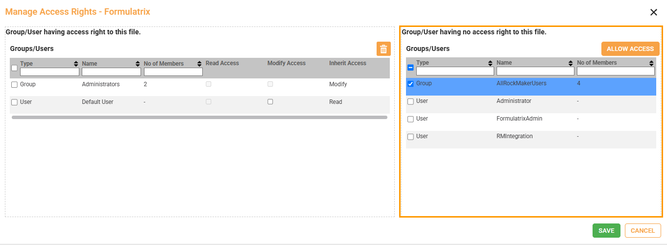 From the Group/User having no access right to this file section, select the user(s) you want to share the access with by clicking the checkbox(es)