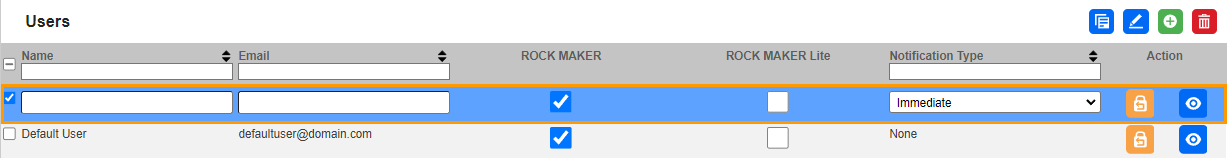 .Go to the Users section and click the Add button on the top right side to add a new row at the top of the list.