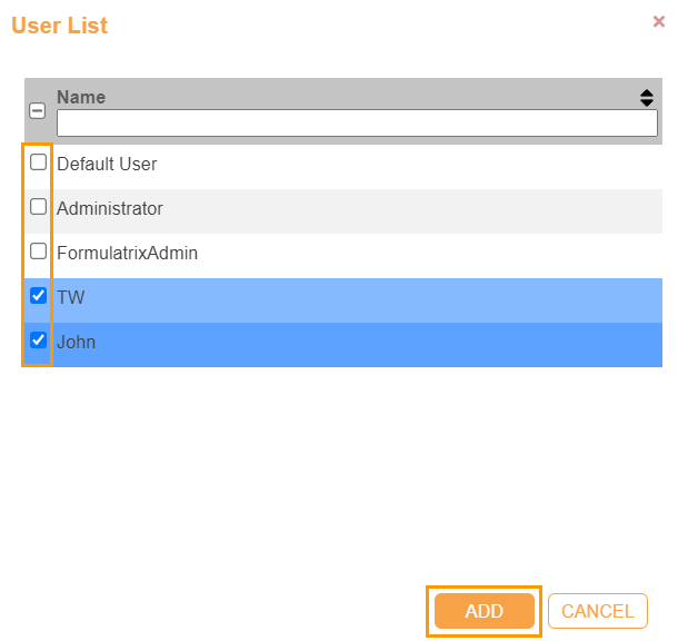 The User List dialog box will appear. Then, select the user(s) you want to add to the group by clicking the provided checkbox(es) and click ADD.