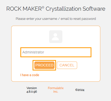 On the available page, enter your username or email in the Username or Email field and click PROCEED. ROCK MAKER then sends a one time code, expiring in 1 hour, to your registered email.