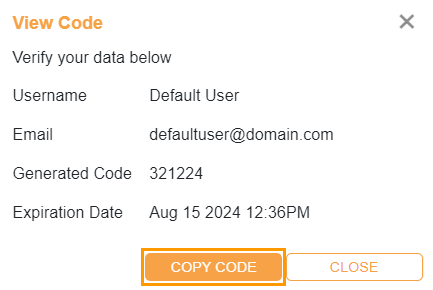 In the View Code dialog box, click COPY CODE and send it to the corresponding user.