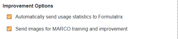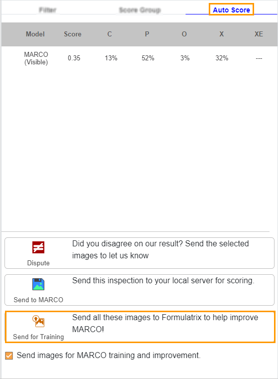 Send images for MARCO training and improvement. Selecting this option will enable the Send for Training button in the Auto Score tab of the Score panel. You can send images to FORMULATRIX to improve auto scoring performance by clicking the button.