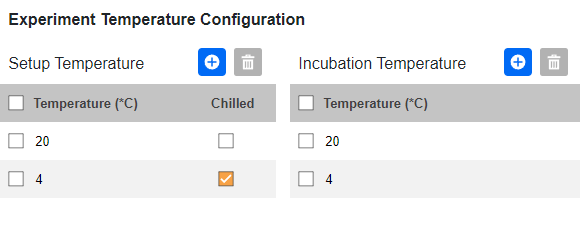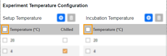 Select the setup or incubation temperature(s) by clicking an appropriate checkbox in the Temperature (*C) column. To select all temperatures at once, click the box on the top left of the setup or incubation table.