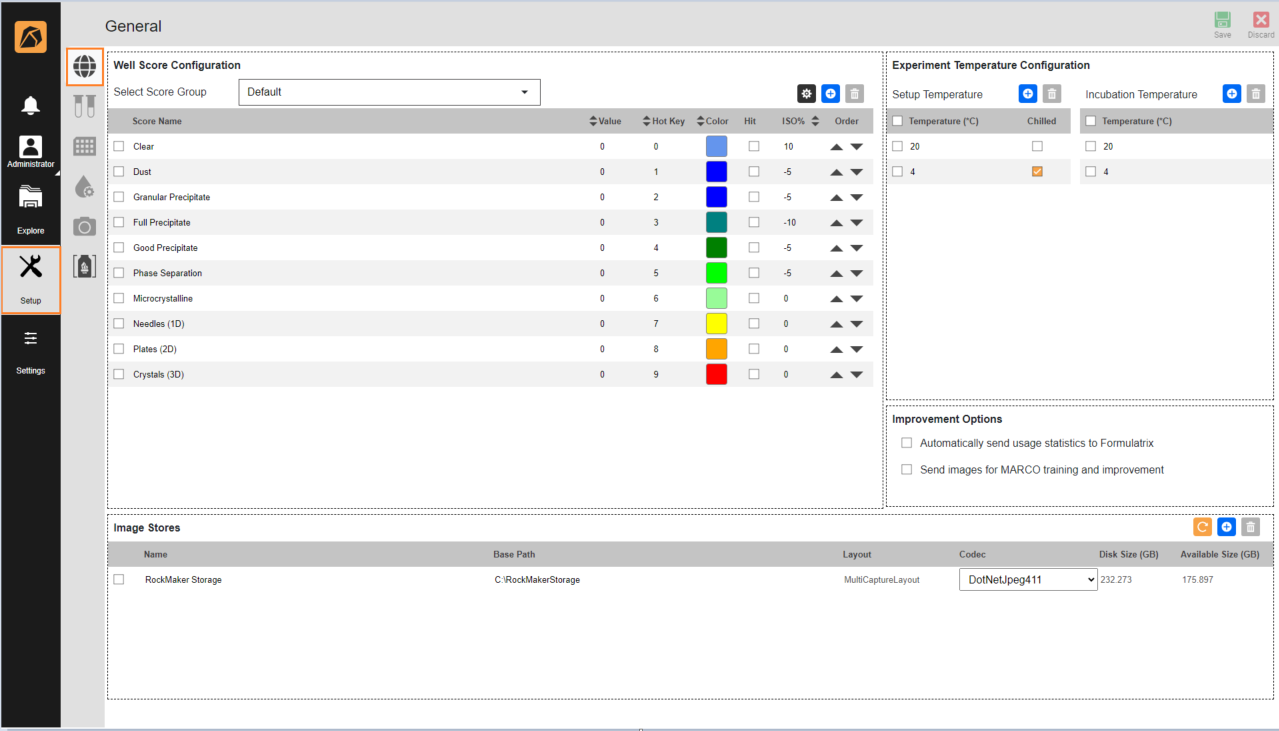 General submenu helps you set up scoring, temperature, improvement feedback, and image storage. It comprises Well Score Configuration, Experiment Temperature Configuration, Improvement Options, and Image Stores sections.