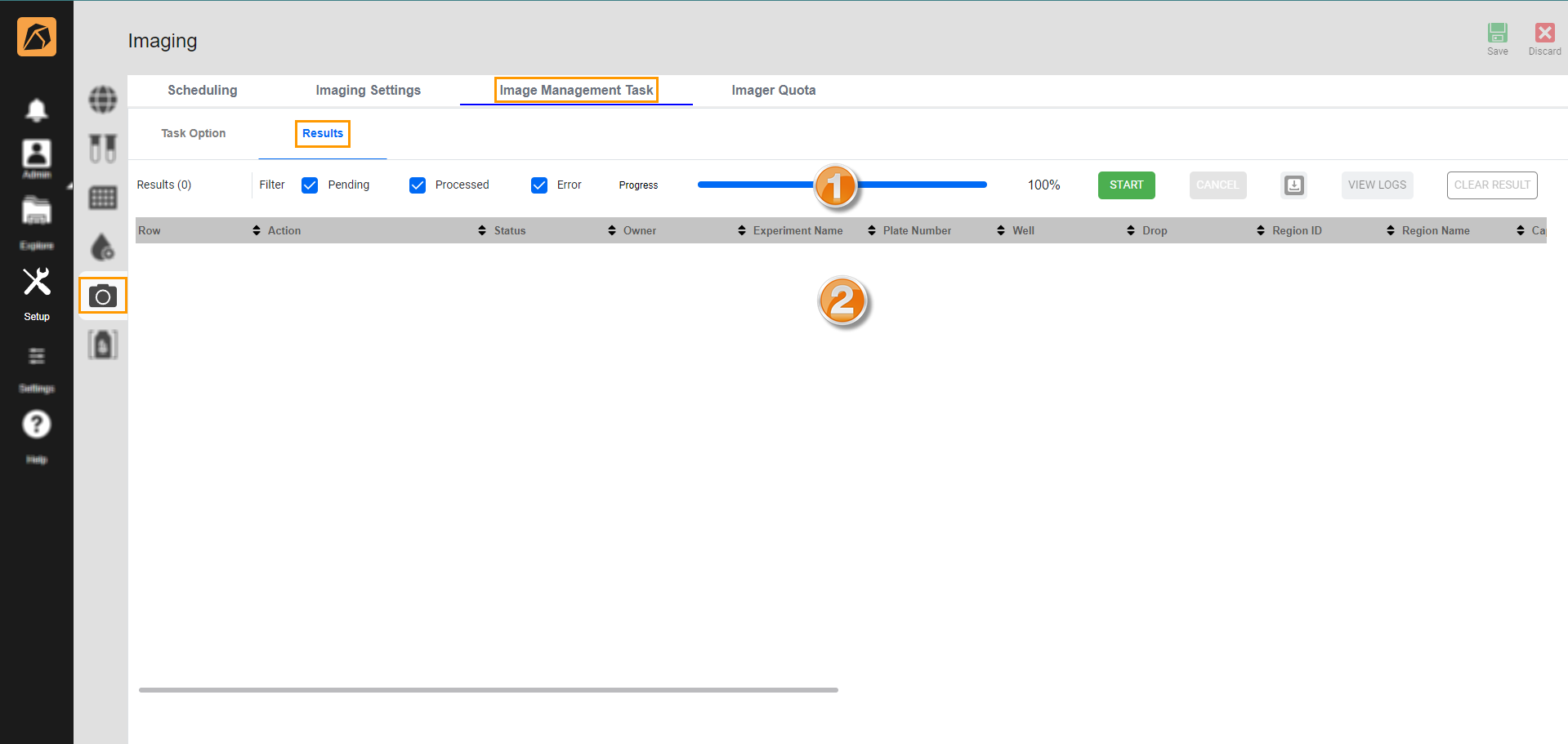 The Results subtab displays a record of each task. Once an image management task is executed, ROCK MAKER automatically opens the Results subtab.