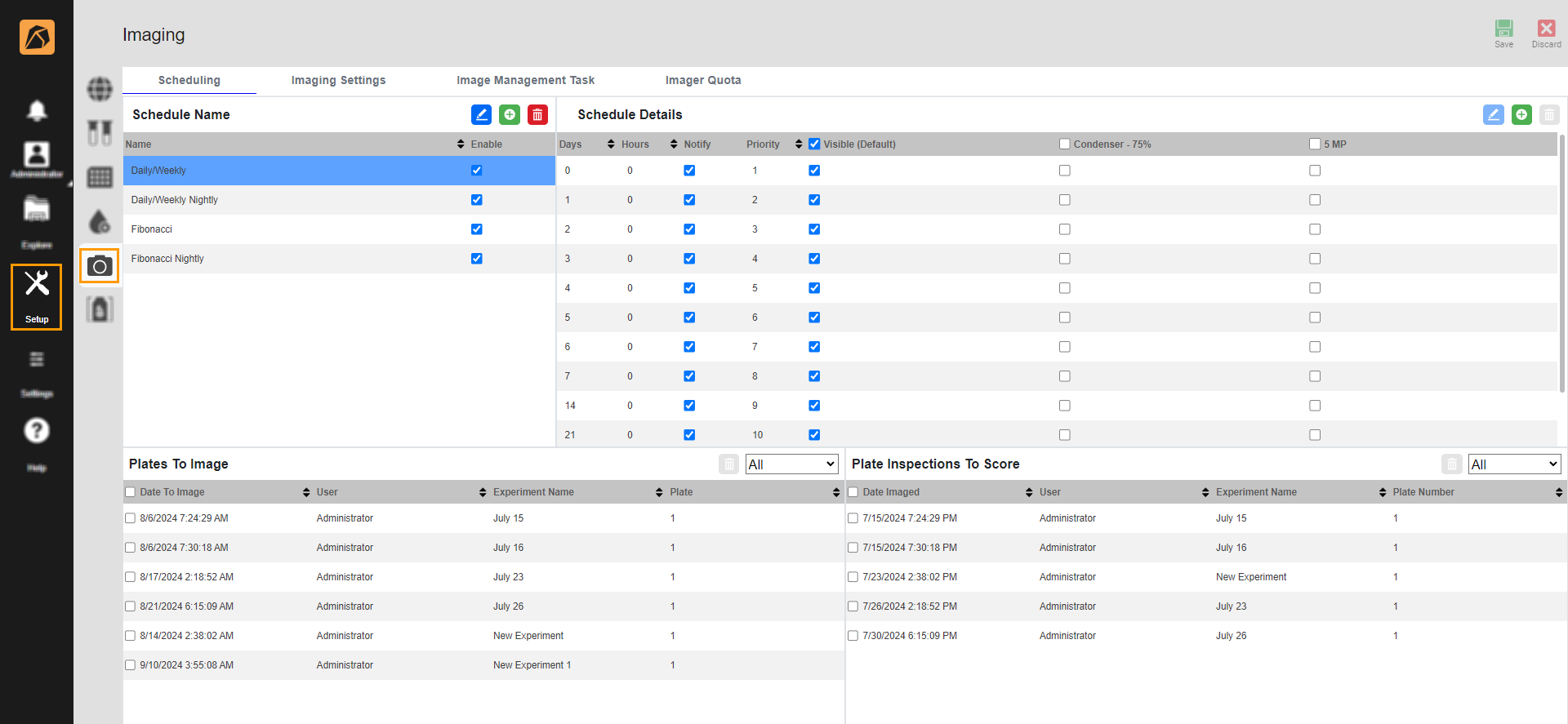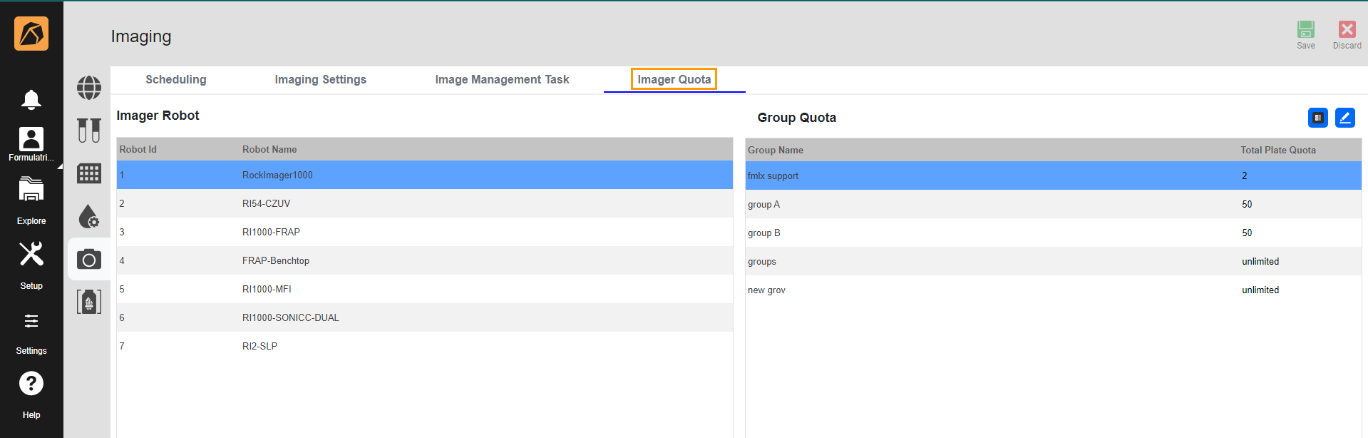The Imager Quota tab enables administrators to assign a plate quota to each available imager. Setting plate quotas can control the number of plates each imager uses.