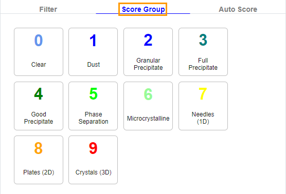 This tab displays the autoscore results that include clear (C), precipitate (P), other (O), crystal (X), and crystal-else (XE).