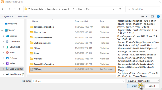 Locate the sequence file in the User folder or your local directory. Double-click on the selected file or click Open.