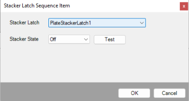 Set the plate stacker latch to Off (closed) or On (open) state from the Stacker State option. Off state means the latch will hold the plate in the stacker, and On means the latch will release the plate(s).