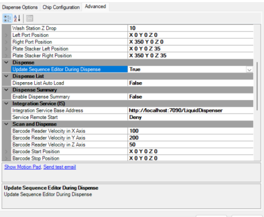 Note: During the sequence execution, the blue highlight will move as the commands in the Sequence Editor Table are executed. You can disable this display by setting the Update Sequence Editor During Dispense option to False. For more information, read the Dispense Settings under the Advanced Options section in the Using the Options Menu topic.