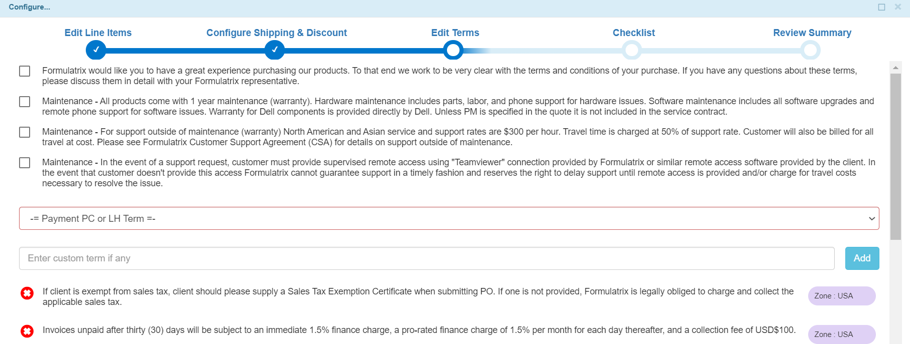 All of the Sale Terms that apply to the Quote in question will also be displayed in the Edit Terms section of the Quote wizard.