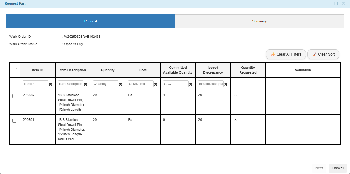 Added a Request Part action in the Work Orders table for Open to Buy status, allowing users to directly take needed parts from the warehouse based on Committed Available Quantity (CAQ) availability. The system will automatically create Issued Out transactions to speed up the process and reduce warehouse administrative workload.