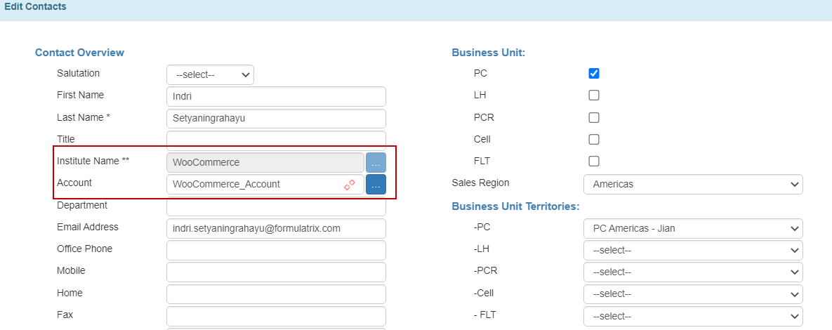 Select one of the accounts in the list to link to the unverified Contact. To decide which valid account to link to, check the sales order or contact the customer via email. Updating the Account field will automatically update the Institute Name field and Primary Address Information section.