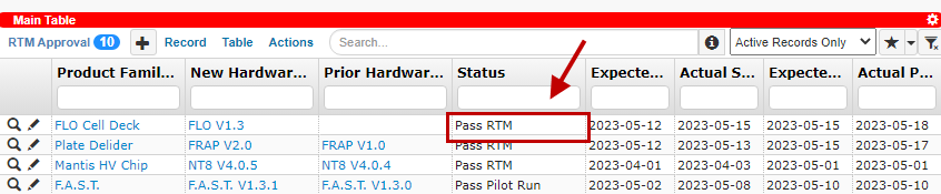 The RTM goal is for the production division to create a new product or product version. The actual process mainly involves the production division and process engineers (PE), but the “NPI” (New Product Introduction) group is responsible for documenting the processes in TIGA. The group will create the record in the RTM Approval table and maintain the RTM process by editing the Status and inputting its Actual Date. After all four approvers approve the Pass Pilot Run record, TIGA will automatically update the status to Pass RTM and fill in the Pass RTM Actual Date field.