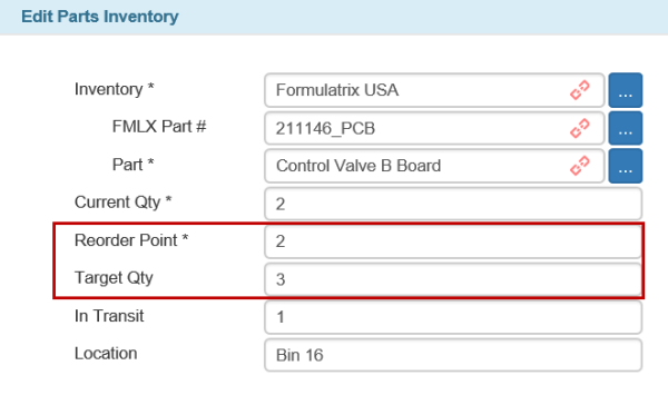 Reorder Point and Target Qty Fields in the Parts Inventory Window
