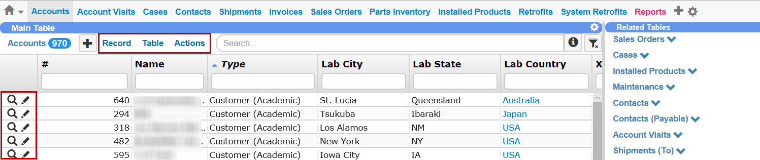 The TIGA user interface has been redesigned for a cleaner and more organized look. Most of the toolbar buttons have been moved to the new Record, Table, and Actions menus above each of the application tables for easier access. See also, Basic TIGA Layout.